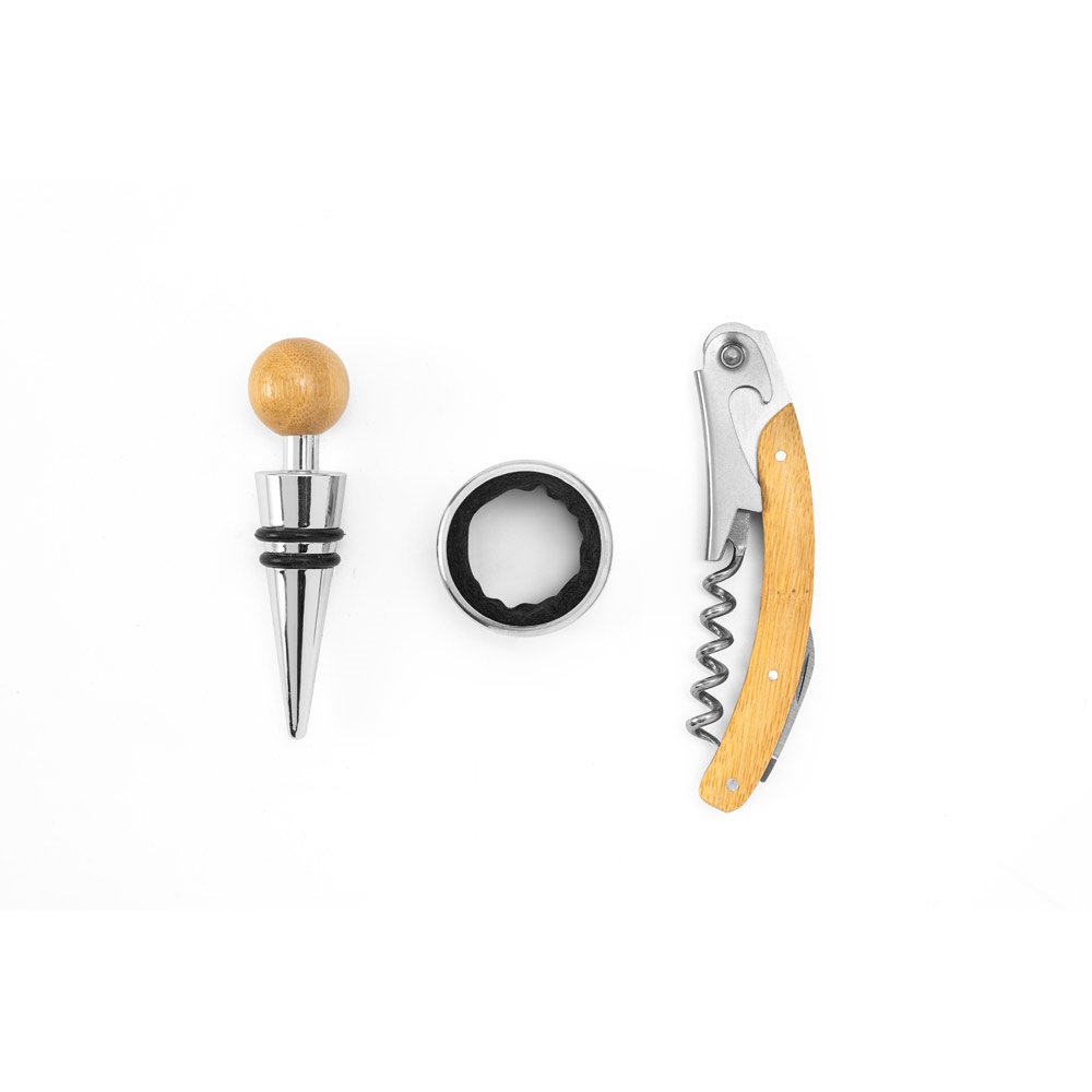 Σετ για κρασί από μπαμπού και ανοξείδωτο ατσάλι. Περιλαμβάνει μέσα στο κουτί: 1 ανοιχτήρι φιαλών, 1 φελλό και 1 μεταλλικό δαχτυλίδι. Παρέχεται σε κουτί δώρου από χαρτόνι kraft. Επειδή πρόκειται για προϊόν από φυσικά υλικά, το χρώμα του προϊόντος και το αποτέλεσμα της εκτύπωσης μπορεί να διαφέρουν μεταξύ των προϊόντων