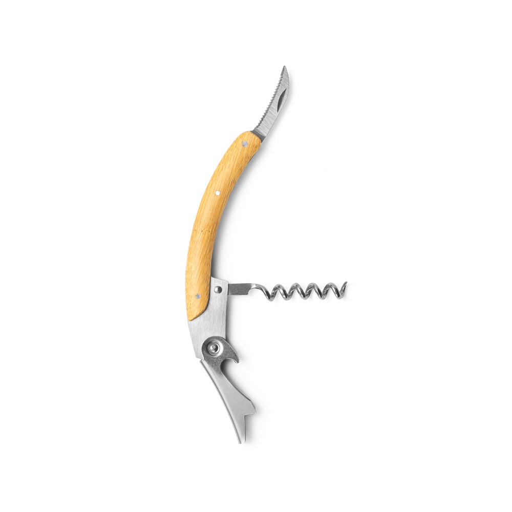 Σετ κρασιού από μπαμπού, ψευδάργυρο και ανοξείδωτο ατσάλι. Αυτό το σετ περιλαμβάνει: ανοιχτήρι με μαχαίρι σομελιέ, θερμόμετρο, πώμα και πώμα στάγδην. Καθώς το προϊόν είναι κατασκευασμένο από φυσικά υλικά, το χρώμα του προϊόντος καθώς και το αποτέλεσμα της εκτύπωσης ενδέχεται να διαφέρουν από προϊόν σε προϊόν