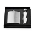 Σετ με φλασκί από ανοξείδωτο ατσάλι (200 mL), χωνί και 4 φλιτζάνια χωρητικότητας έως 20 mL. Παρέχεται σε συσκευασία δώρου. 189 x 40 x 168 mm