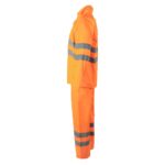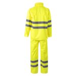 Στολή βροχής (130g/m²), από πολυεστέρα (100%) με επίστρωση PU.Μπουφάν, με κεντρικό φερμουάρ, αντανακλαστικές λωρίδες στον κορμό και τα μανίκια και κρυφή κουκούλα στο εσωτερικό του γιακά. Το εσωτερικό πλέγμα από πολυεστέρα (100%) και οι μεταλλικές οπές προάγουν την αναπνοή. Το μπουφάν είναι ρυθμιζόμενο με πώμα- και διαθέτει 2 κρυφές κάτω τσέπες με πτερύγιο. Παντελόνι: ελαστική ζώνη και κλείσιμο με κουμπιά. Διαθέτει αντανακλαστικές λωρίδες στο κάτω μέρος του παντελονιού και πλαϊνά ανοίγματα με πτερύγιο για πρόσβαση στις τσέπες. Με ρυθμιζόμενα κουμπιά στο κάτω μέρος. Παραδίδεται σε τσάντα. Προϊόν σύμφωνα με τον κανονισμό ΕΕ 2016/425, πιστοποιημένο κατά EN20471 και κλάση Nº 3. Μέγεθος: M, L, XL, 2XL, 3XL