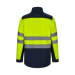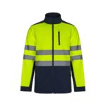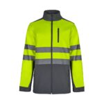 Δίχρωμη ζακέτα από soft shell (280g/m²), από πολυεστέρα (96%) και ελαστάνη (4%). Με επικάλυψη TPU και επένδυση από fleece. Κεντρικό ανάποδο φερμουάρ σε αντίθετο χρώμα, ρυθμιζόμενες μανσέτες με άγκιστρο και θηλιά. Ανακλαστικές λωρίδες στον κορμό και στα μανίκια. Περιέχει πέντε τσέπες: 3 τσέπες με φερμουάρ και 2 εσωτερικές τσέπες. Προϊόν σε συμμόρφωση με τον κανονισμό ΕΕ 2016/425, πιστοποιημένο κατά EN20471 και με αριθμό κατηγορίας 2. Μέγεθος: S, M, L, XL, 2XL, 3XL
