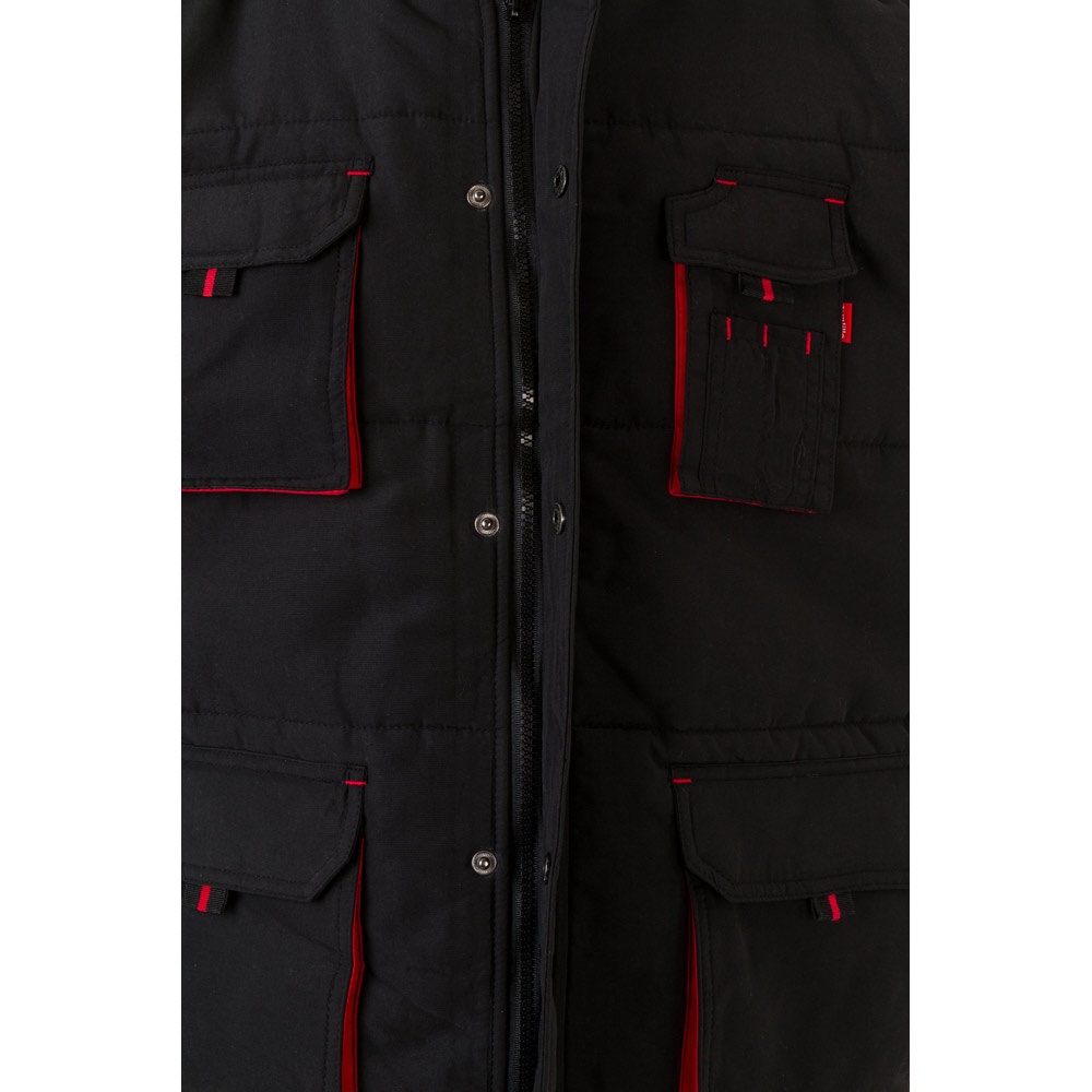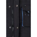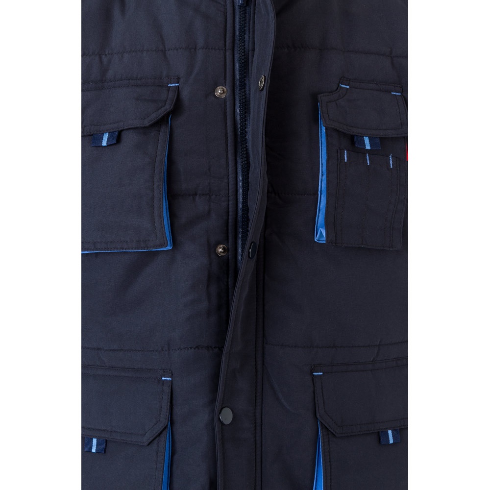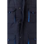 Μπουφάν με επένδυση (unisex) 100% πολυεστέρα (εξωτερικό: 240 g/m² 100% πολυεστέρα pongee 240 και αδιάβροχη επίστρωση PVC. Εσωτερικό 65 g/m² 100% πολυεστέρα ταφτά. Πλήρωση: πολυεστέρας 100% (80 g/m²). Περιλαίμιο με μαύρο πολικό πλέγμα (κλείνει με ιμάντα με γάντζο και βρόχο). Πτυσσόμενο κάλυμμα στο κολάρο, ρυθμιζόμενο μέσω μαύρων πωμάτων. Ανοιγόμενο πτερύγιο, χρωματιστό φερμουάρ, με γάντζο και βρόχο και μαύρο ελατήριο. Περιέχει 2 εξωτερικές τσέπες με πτερύγιο και 2 εσωτερικές τσέπες (1 για κινητό τηλέφωνο) με κλείσιμο με γάντζο και βρόχο. Εσωτερικά μανίκια 2×2 με ραβδώσεις και ρυθμιζόμενες εξωτερικές μανσέτες με ιμάντες με γάντζο και βρόχο. Θερμικά σφραγισμένες ραφές. Φερμουάρ με πρόσβαση στη κάτω πλάτη για εύκολη προσαρμογή