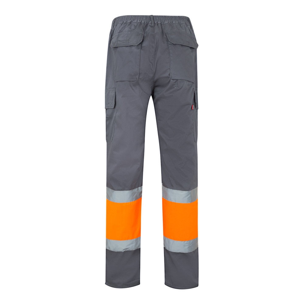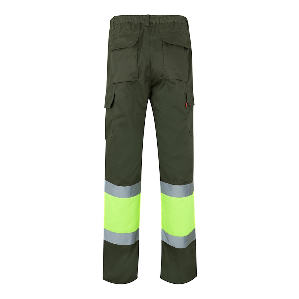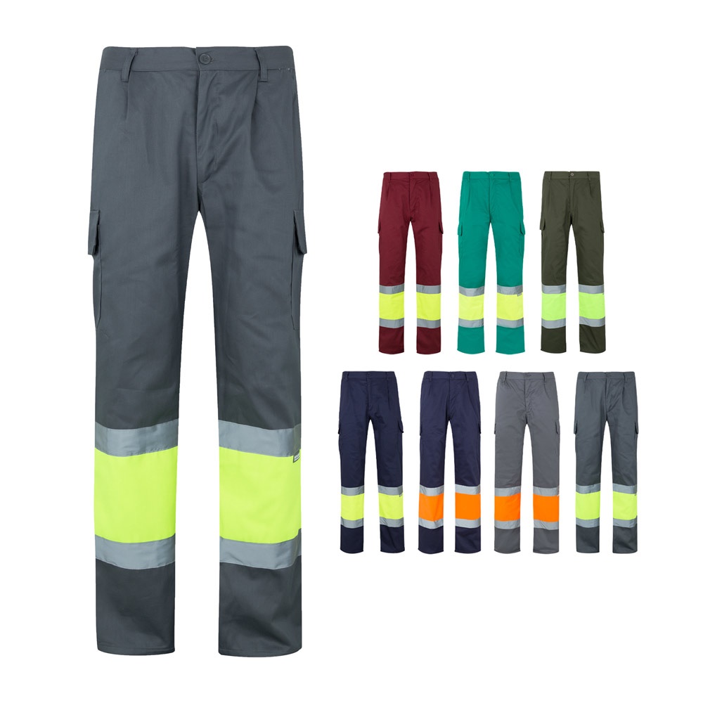 Δίχρωμο παντελόνι από twill (210g/m²), με επένδυση, πολλαπλές τσέπες, από βαμβάκι (20%) και πολυεστέρα (80%). Με ελαστική ζώνη στη μέση, με αντανακλαστικές λωρίδες στο κάτω μέρος του παντελονιού. Περιέχει έξι τσέπες (2 γαλλικές τσέπες, 2 πλαϊνές τσέπες και 2 πίσω τσέπες). Προϊόν σε συμμόρφωση με τον κανονισμό ΕΕ 2016/425, πιστοποιημένο κατά EN20471 και με αριθμό κατηγορίας 1