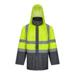 Δίχρωμο παρκά 4 σε 1 (180 g/m²), από πολυεστέρα (100%) με επίστρωση PU. Τέσσερα κομμάτια σε ένα: παρκά, αδιάβροχο, σακάκι και γιλέκο.Πάρκα/αδιάβροχο: με κρυφό κεντρικό φερμουάρ με πατιλέτα, που κλείνει με γάντζο και θηλιά, ανακλαστικές ρίγες στον κορμό, στους ώμους και στα μανίκια και κρυφή κουκούλα. με δύο κάτω τσέπες. Μπουφάν/γιλέκο: με κεντρικό φερμουάρ, ανακλαστικές ρίγες στον κορμό και τους ώμους, ριμπ μανσέτες και αποσπώμενα μανίκια. Με τρεις τσέπες (2 κάτω τσέπες και 1 εσωτερική τσέπη). Προϊόν σε συμμόρφωση με τον Κανονισμό ΕΕ. 2016/425, πιστοποιημένο με EN20471 και κλάση Nº 2