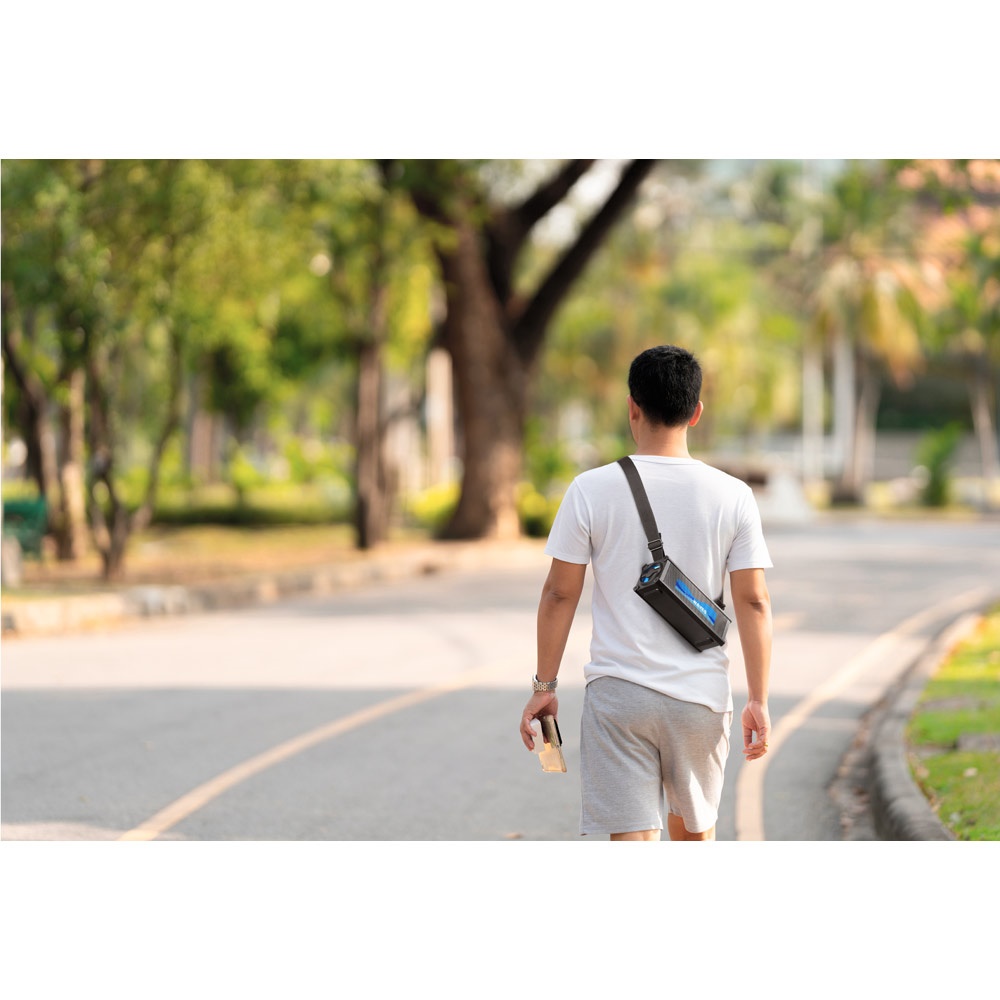 Φορητό αδιάβροχο ηχείο με βαθμολογία IPX4, με λαβή 1200 mm για εύκολο κρέμασμα ή μεταφορά, ρυθμιζόμενη στο σώμα ή με κοντή λαβή. Σε καταστάσεις έκτακτης ανάγκης, η μπαταρία μεγάλης χωρητικότητας επιτρέπει την εύκολη φόρτιση άλλων συσκευών. Πλήρως προσαρμόσιμη μάσκα.