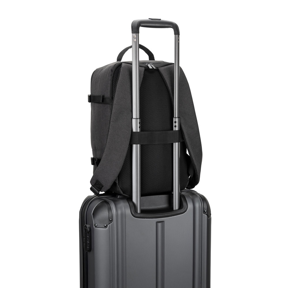 Σακίδιο φορητού υπολογιστή υψηλής πυκνότητας 900D και μουσαμά. Το φινίρισμα του μπροστινού πίνακα του προσδίδει μια απαλή αφή, καθιστώντας τη χρήση του πιο άνετη. Αντικλεπτικό σύστημα: κύριο διαμέρισμα με κρυφό φερμουάρ και πίσω με 2 κρυφές τσέπες με μεταλλικά φερμουάρ, για μεγαλύτερη ασφάλεια. Κύριο διαμέρισμα με επένδυση και επένδυση, με 2 διαμερίσματα για φορητό υπολογιστή έως 15,6″ και tablet έως 10,5″. Το σακίδιο έχει αρκετές εσωτερικές τσέπες, συμπεριλαμβανομένης της επένδυσης τσέπης smartphone, με πρόσβαση στην πρίζα ακουστικών. Στο εσωτερικό, διαθέτει βρόχους διαχείρισης καλωδίων. Στο πλάι, το σακίδιο έχει εξωτερική τσέπη με φερμουάρ και πρόσβαση σε 1 εσωτερική τσέπη. Η εσωτερική τσέπη είναι ιδανική για μεταφορά φορητής μπαταρίας, καθιστώντας εύκολη τη φόρτιση διαφόρων φορητών συσκευών. Επένδυση ιμάντων και πλάτης, με σύστημα στήριξης με επένδυση για την πλάτη και 1 τσέπη με φερμουάρ. Δεν περιλαμβάνονται αξεσουάρ. Χωρητικότητα έως 25 L